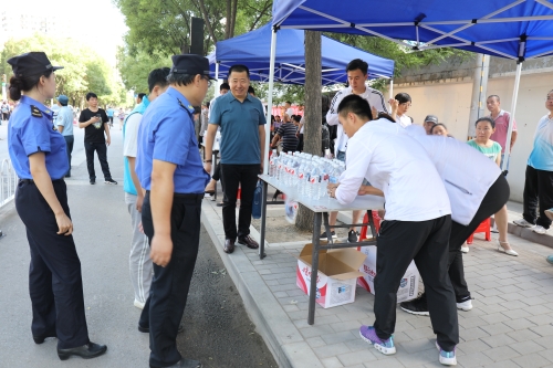 借助此次高考保障,丰台城管执法监察局还在北京十二中的高考保障现场举行了城管开放日活动。活动现场邀请了临近社区、村的6名居民,配合城管队员一起,服务高考考生和家长、巡查学校周边道路、走访宣传学校周边施工工地。在巡查中,城管队员发现在距离学校不远处的便道上,也有几个人支上了桌子和遮阳伞,正在往桌子上摆饮用水。队员询问发现,这些人是一家酒饮集团的员工,来这借着服务考生推广产品。执法队员当场要求其停止宣传行为,还路于高考考生,若再次发现宣传行为城管部门将依法予以查处。